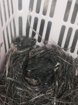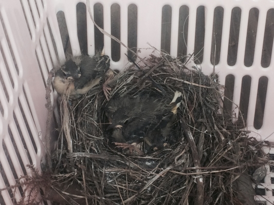 飛び上がりました、私が巣を覗き込むと雛が団子