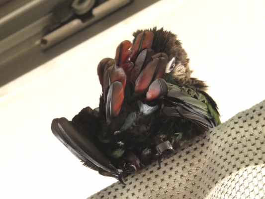 放鳥時、呼んでも来ない事が多い仔も、一羽を肩に乗せたりカキカキしてると、皆バサバサ寄ってきて我も我もと肩に登って来たり、3,4羽の頭がにょきにょき出てきたり…。