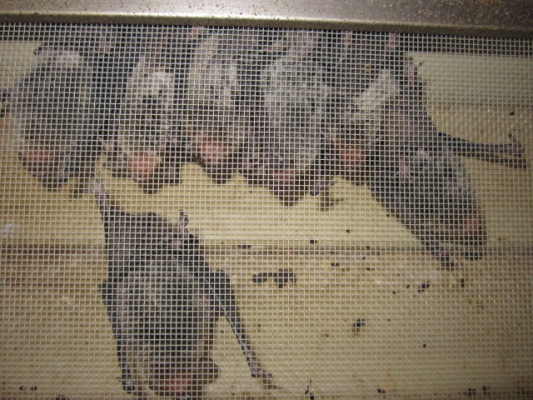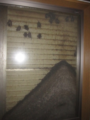 >作業に際しガラス窓を開けると、もうエライ数のコウモリが襲ってくる〜!!