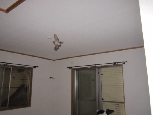 作業に際しガラス窓を開けると、もうエライ数のコウモリが襲ってくる〜!!
