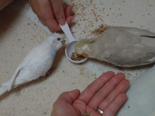 ピオンとコットンが同じエサ入れで仲良く食べる?