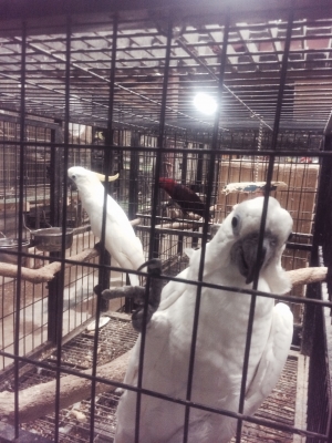 行ってみると、翁インコたちの巣立ち雛が広い禽舎で
