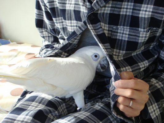 放鳥時、呼んでも来ない事が多い仔も、一羽を肩に乗せたりカキカキしてると、皆バサバサ寄ってきて我も我もと肩に登って来たり、3,4羽の頭がにょきにょき出てきたり…。