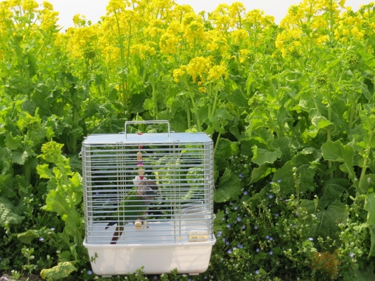 菜の花畑では大勢の人を初めて見たので少々パニックになっていましたが、可愛いいねーインコもお散歩?って言われてまんざらでもなさそうでした
