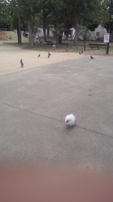 >今日は公園でヒロシと散歩してたらハトさんが沢山いて、ヒロシがトコトコ寄って行く姿が可愛かったです