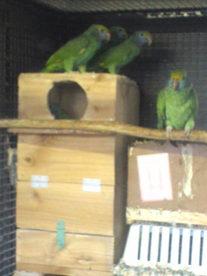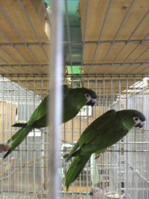 ケージから首を出すキエリボウシインコ コミドリコンゴウのペア 禽舎のキンガオボウシインコ