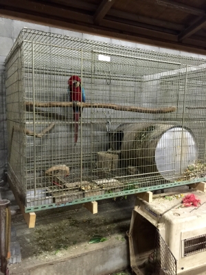 夕方、ベニコンゴウインコのケージに大根の葉っぱを