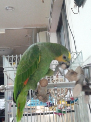 『おはよ』『ノアちゃんこんにちは』『おやっちゅみ』『バイバイ』『おいで』『ちーちゃん』『ええ子やね』『はいっ』は我家のインコ達の共通語。それに、それぞれの鳴真似も!何より困るのはコミドリコンゴウインコの鳴き真似。これだけは止めてほしい…。