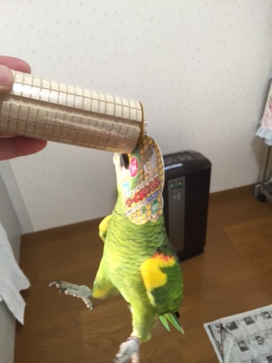 コバタンのコバちゃんに「かじり木コーン」を見せたら驚いちゃいました。(^^;;