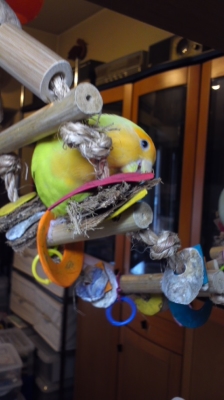 >たいようは、少し?違う止まり木や、おもちゃを、見せ続けても、一向に、慣れてくれないので、私の方が、怖がる姿を見ていられなくなって、早々に、撤収してしまいます(T_T)