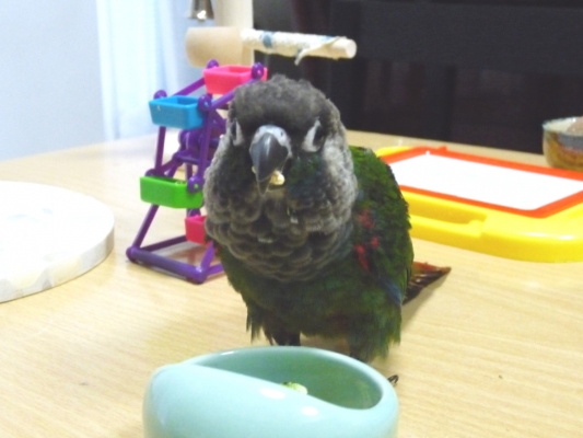 『おはよ』『ノアちゃんこんにちは』『おやっちゅみ』『バイバイ』『おいで』『ちーちゃん』『ええ子やね』『はいっ』は我家のインコ達の共通語。それに、それぞれの鳴真似も!何より困るのはコミドリコンゴウインコの鳴き真似。これだけは止めてほしい…。