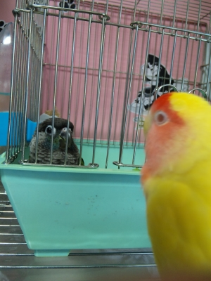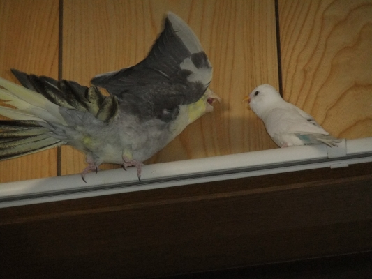 クーちゃんがルナのケージに止まると急いではなさないと怪我します