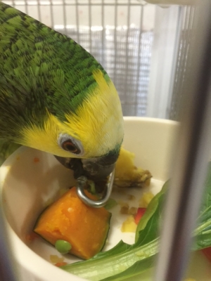 今夜は、どうもいつもと様子が違うペアーがいるので朝に続き小松菜を入れてあげると、そのまま咥えてとまり木に登り足で鷲掴みでガツガツと食べていました、次いでに各ケージに塩土を配りました、たぶん、孵化したんでしょうね、