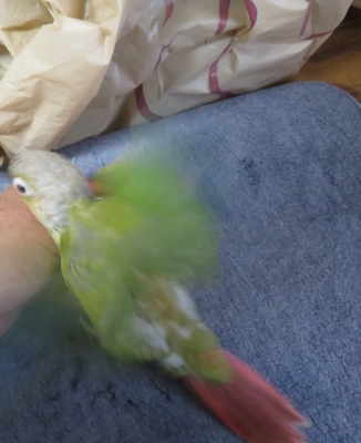 クーちゃんは、全くリリチャンに焼きもちは焼きませんが、自分のケージに着地するのは許せないのか、足を狙っているようで、飼い主は気が気ではありません