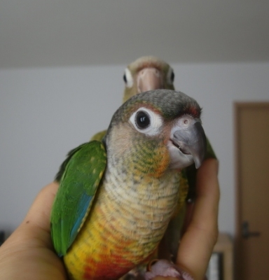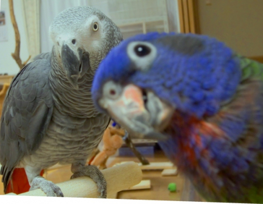 『おはよ』『ノアちゃんこんにちは』『おやっちゅみ』『バイバイ』『おいで』『ちーちゃん』『ええ子やね』『はいっ』は我家のインコ達の共通語。それに、それぞれの鳴真似も!何より困るのはコミドリコンゴウインコの鳴き真似。これだけは止めてほしい…。