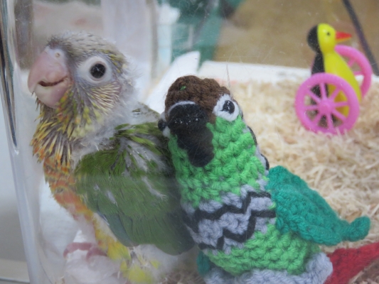 クーちゃんより体重も声も大きいのに、クーちゃんに雛鳴きしてしているリリーちゃんにクーちゃんも戸惑いながらも、少し慣れたのか、プラケ越しにのぞくようになりました