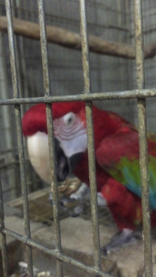 今朝の禽舎はアカサカオウムのオモチャがほぼ壊滅状態になりましたので新しいオモチャをケージ内に吊り下げました、私がオモチャを持って禽舎内に入ると、オモチャに直ぐに気が付いたアカサカオウムのP子がケージ奥から颯爽と飛んで来ました