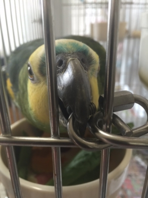 ケージを開けて、餌入れを取り、水入れを取った瞬間でした、バサバサッと私の手を目掛けて飛んで来たんです、私は恐怖を感じ、慌ててケージの扉を閉めたんです、しかし、扉が閉まらない?ナント頭が出て首を挟んでいる!何故か私の顔に笑みがこぼれる(笑)少し学習しろよ!と言ってやりました、