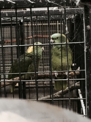 夕方ジャングルの鳥さん達の世話も半分が過ぎた辺りで見学させてください、と2人の方が来られました、動物が好きで、以前は王子動物園で働きたく数回受けたそうですが、ダメだったそうです、農業大学、畜産科の酪農?を卒業したそうです、クルマサカオウムとキエリボウシインコに魅入られていました、