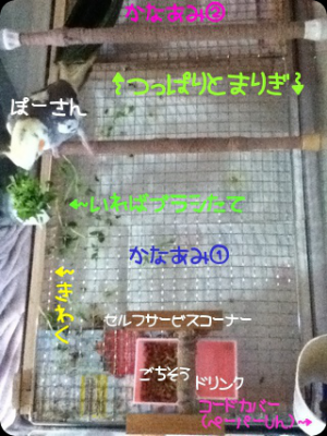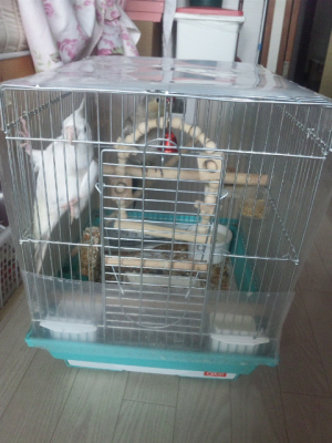 少しティアラのケージより大きめなので大きい部分は洗濯はさみでとめて調節しています。