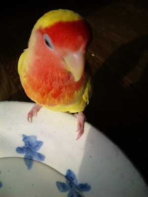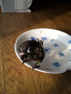 うちのまめは、バードバスだとどうも狭いらしく、放鳥中にしか水浴びしません。