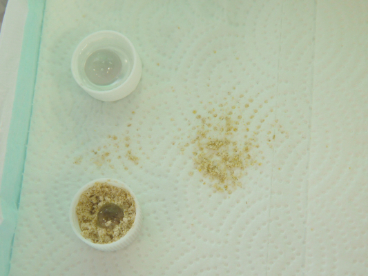 湿度を上げて少しでも孵化しやすいように、ペットボトルの蓋に湿らせたティッシュを詰めて入れておきました(写真2枚目)