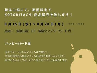 【KOTORITACHI】8月15日〜20日 銀座三越【ハッピーバード展】にて小鳥デザイン雑貨販売いたします!