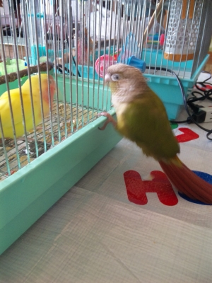 子桜にウロコインコが興味をもって、いくら注意しても子桜のケージにちょっかい出しに行きます
