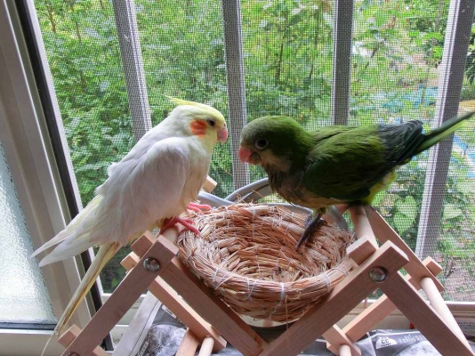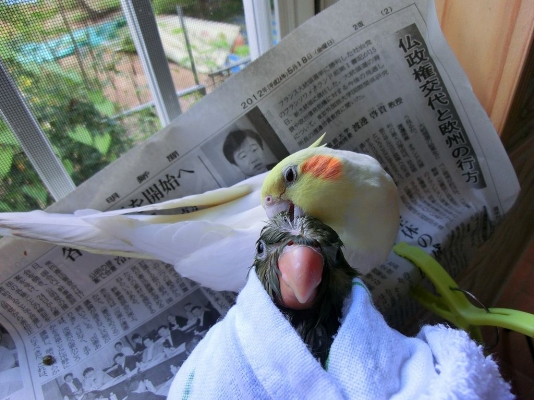 オキナインコのヒナちゃんのお世話をするオカメちゃん、可愛いですね(*⌒∇⌒*)