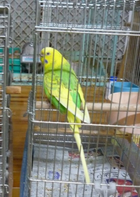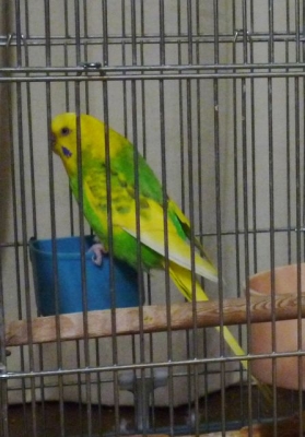 鼻が茶色のメス,名はレモンです。頭と羽はは黄色,背と腹は黄緑です。人には全く慣れていません。見かけた方,保護した方はご連絡よろしくお願いします。