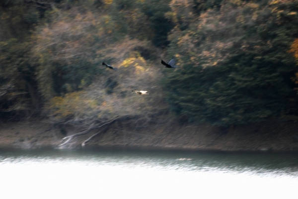 紅葉をバッグに鬼ごっこするノスリとカラス←