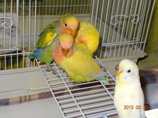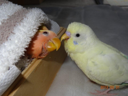 同じかごでほんわか仲良くしていて、セキセイが来ても