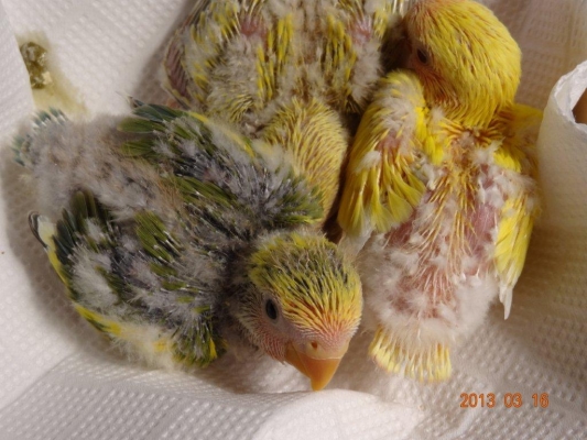 成長差は親鳥の与える餌の量や、餌の質、雛の数、個体の状態などで差が出てきますが、一羽目の雛ちゃんと同じくらいになっているのがベストなんですが、3羽の雛たちはもうしばらく親に育ててもらうか、挿し餌に慣れているのでしたら、取り出して栄養の良い挿し餌を与えて、育ちを良くする方法もあります。慣れている方ならこのくらいからでも育てますが、挿し餌に自信がなければ無理して取り出さず、親鳥にもうしばらく大きくなるまで育ててもらってもいいですね。