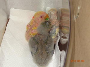 一羽目の雛ちゃんは、多分すぅちゃんと同じ羽色だと思いますが、成長して頭、頬、腰にどんな色がでてくるのかが楽しみですね!(o^―^o)ニコ