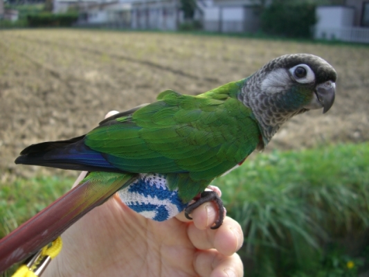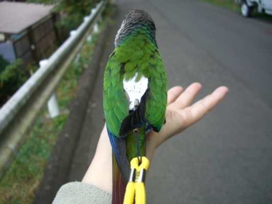いつかフライングスーツでお出かけする訓練をと首に手作りのリボンタイ(首輪?)のようなものを放鳥するたびにつけているのですが、そんなに嫌がらなくなってきてるのですが、たまに手縫いの部分をもしゃもしゃして、数回使うと壊れてしまったりするのでおそらく手縫いで作ってもすぐ壊されてしまうかなぁと…(^。^A