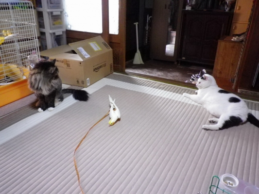 それどころか、インコの方が一方的に猫に近づいていって毛を引きちぎったりするという逆転状態が起こっています。