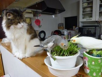 我が家にも猫1匹とセキセイインコ6羽が居ますが・・・家の場合は猫を引き取ってきた初日にセキセイインコ達が猫に襲い掛かって耳や尻尾を齧っていじめて以来、猫のほうがインコを恐れて手出しをしなくなってしまいました。