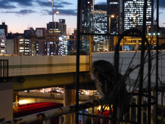 にしても、夕暮れ、ビルから街を見下ろすフクロウのシルエットも