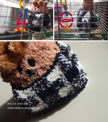 大好きなコザクラインコのPUCCI♥素敵なBIRDBEDを探してもなかなか巡り会えず。この冬の時期もこもこ靴下を購入して一回も履かずにPUCCI用のBIRDBEDをつくります。今回は私好みのクマさん靴下を購入して早速作りました〜慣れてくれるかなぁ♥