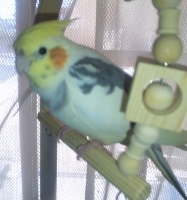 10ヵ月、めす、シナモンパイド(全体が黄色、背中に灰色の模様、ほっぺがオレンジ、尾羽に黒の縞模様あり)