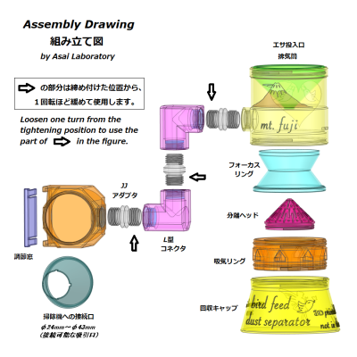 3Dプリンタで製作した分離器で、空エサのゴミを分離しています。掃除機へつないで毎日使っています。ホームページで紹介しています。