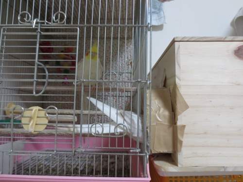 巣箱は先日川井さんのケージ(W398×D236×H217)を購入し