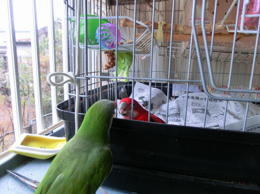 かごには、セキセイが5羽おりまして、その横にはコザクラインコのかごが置いてあります。