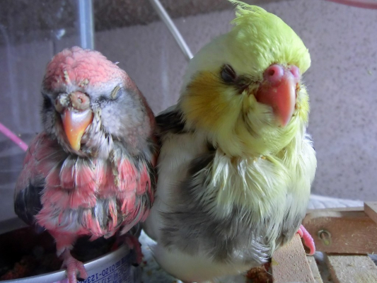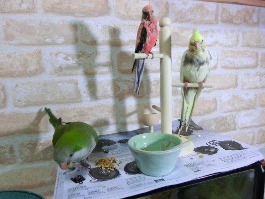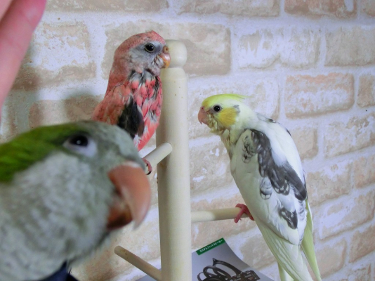 今晩は。アキクサちゃんもオカメちゃんもおりこうさんですね。どらちゃん可愛い〜。ミルクさんのオキナちゃんと小桜ちゃん仲がいいですね、ぴ〜ちゃんの友達候補にセキセイインコと思ったんですけれど、小桜は気が強いのでセキセイインコや小さい鳥だと足や嘴お噛み千切るって聞いたので・・。同じ小桜インコだと卵を産むかも、みなさんは沢山の鳥さんを育てているんですね、私は二羽が限度です。