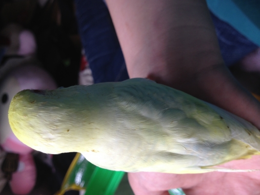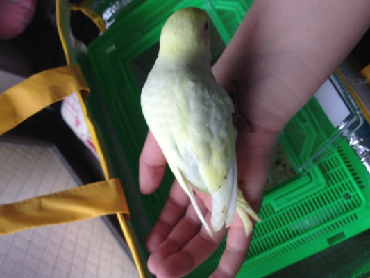 オフホワイトに頭や羽の先が黄色っぽいです。