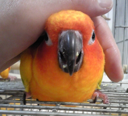 「インコが噛むんですよー」と説明してるのですが、