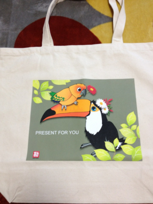 オオハシのバッグどなたが購入したのかな〜?もしかしてオオハシ好きのちっちさんでは〜?でもどうかな〜とモヤモヤしておりましたが、やっぱりちっちさんでしたか!きいママさんのお蔭ですっきりしました。ビールの広告と一緒に写っているのは私も何か意味あり?っと笑えました。お二人共素敵なバッグをお持ちで羨ましいですな〜。でもねっ。私、今日『インコと仲間達トリトブ部屋』っというイベントへ行って来まして、オオハシとコガネメキシコのトートバッグを見つけました。とても南国ムードたっぷりで二羽の表情が良かったので購入しました。ちっちさん好みではないですか?可愛いでしょ?