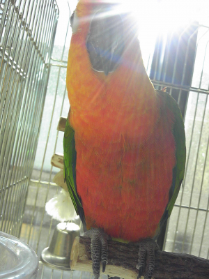 今日はいいお天気です。窓越しに鳥たちを日光浴させています。