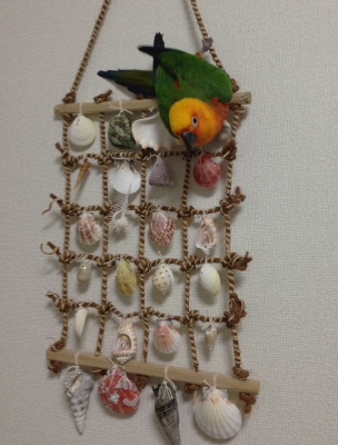 壁に吊るしてあった可愛いバルちゃんが写っていた、貝が沢山ついていた物は鳥さんのオモチャですか?ぴ〜ちゃんも喜んで遊びそうです♪うちでもアサリを酒蒸しして食べた後はぴ〜ちゃんのオモチャになるんですよ、貝を入れ物から放り投げたりして遊ぶんですよ(^-^)