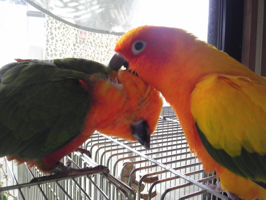 たまに、2羽は私の肩の上でもイチャイチャします。